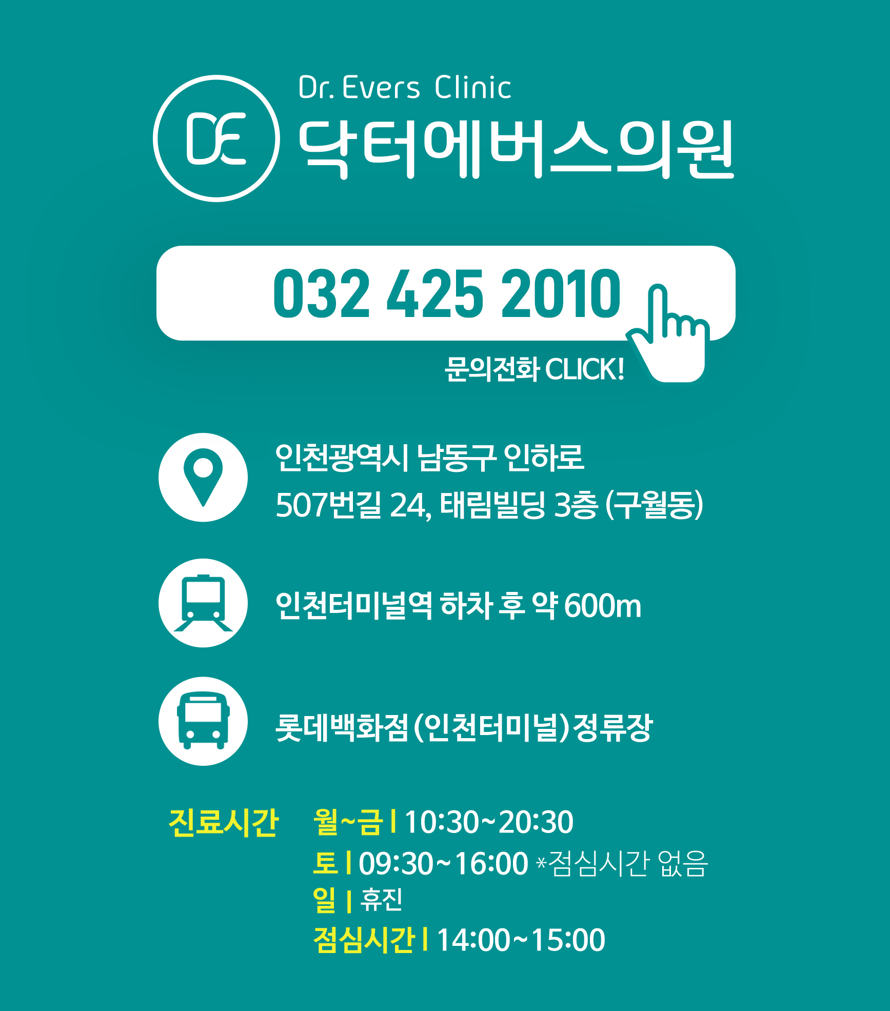 [ 진료시간 ]월~금 : 오전 10:30 - 오후 08:30토 : 오전 09:30 - 오후 04:00 일 : 휴진*점심시간 오후 02:00 - 03:00*토요일,일요일은 점심시간이 없습니다.